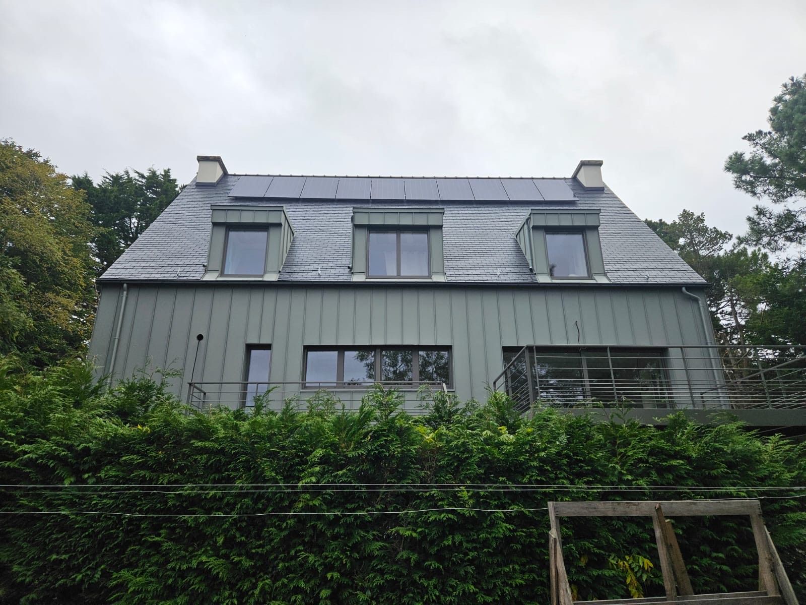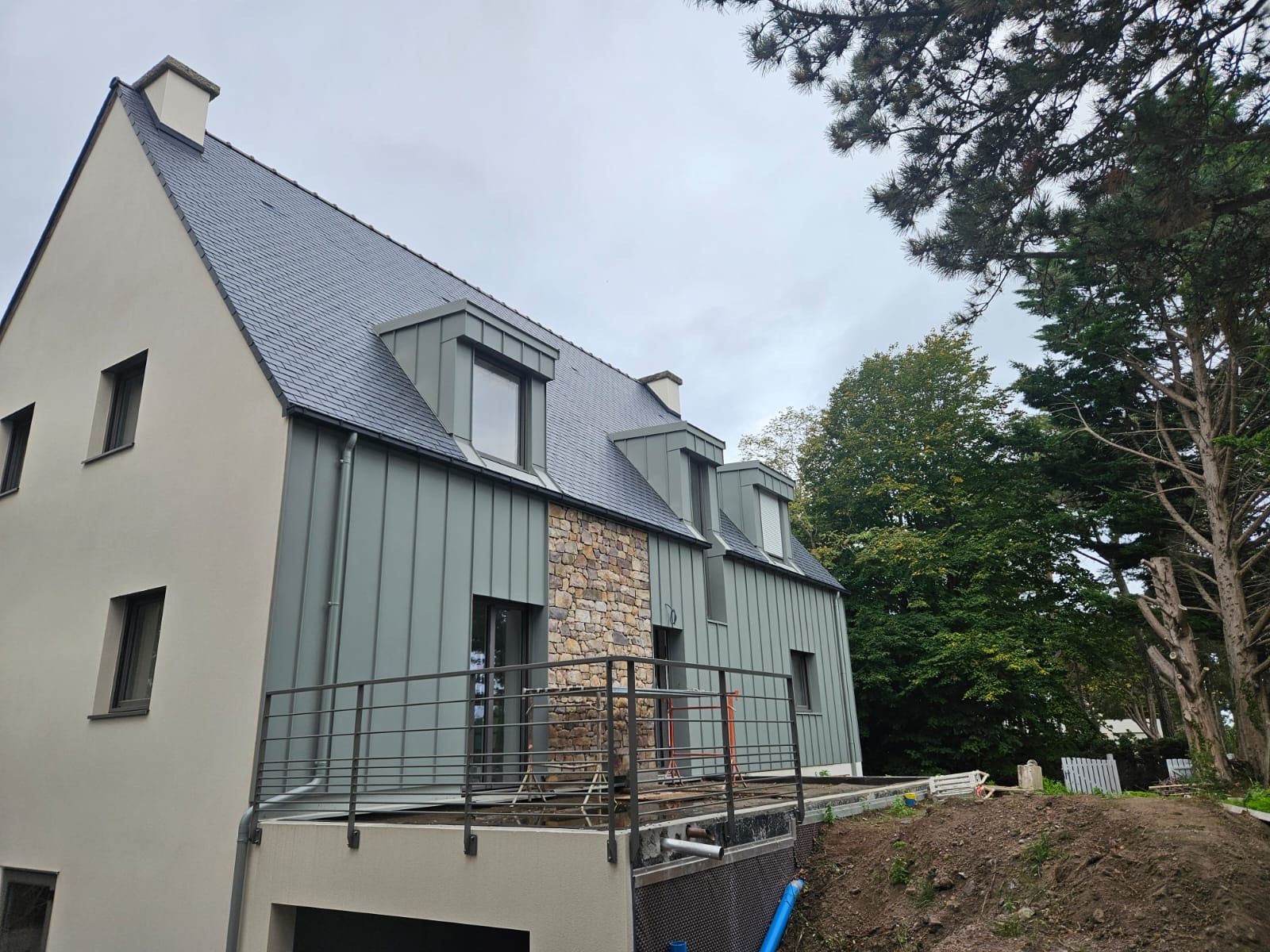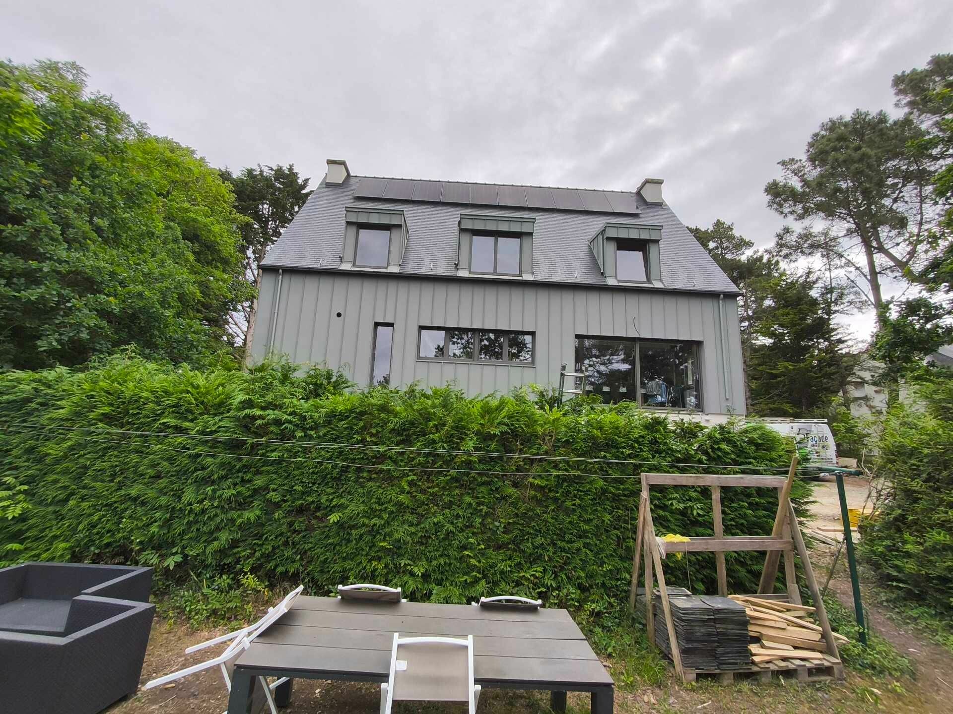 Couverture en ardoises naturelles, habillage des lucarnes, ouvertures en aluminium et un bardage en aluminium gris souris.