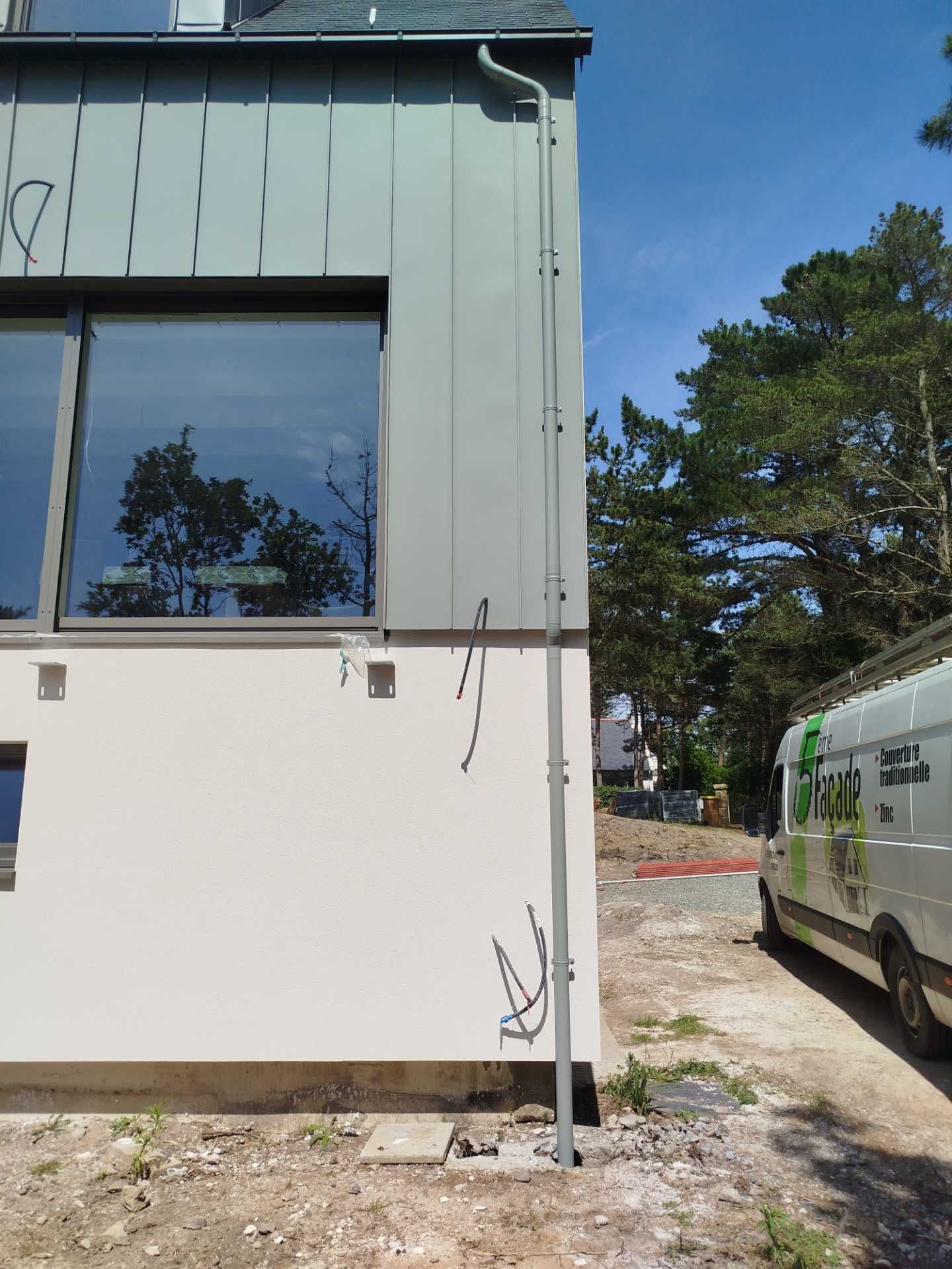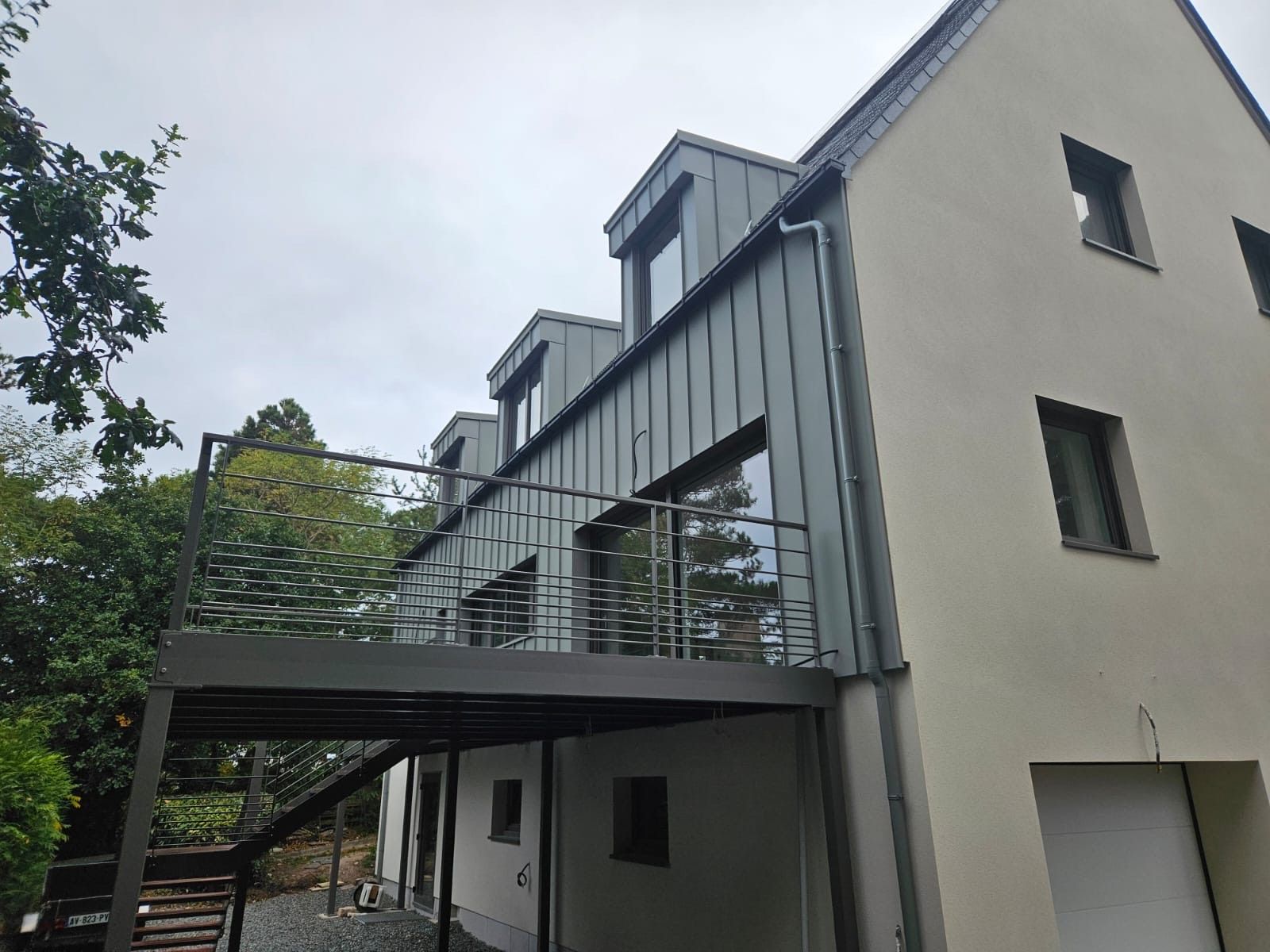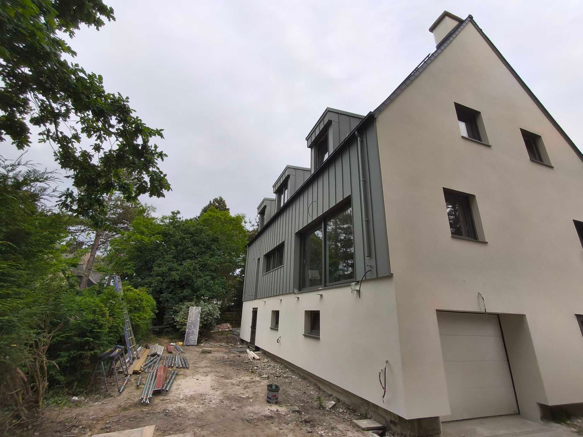 Couverture en ardoises naturelles, habillage des lucarnes, ouvertures en aluminium et un bardage en aluminium gris souris.